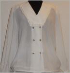 V-Ausschnitt mit 9-fach Biesen verziert, das ganze krönt eine edle 2 cm breite Spitze die Bluse ist im Vorderteil doppelt geknöpft mit 6 Knöpfen, perlförmig mit Goldkranz die Bluse hat leichte Schulterpolster und lange Ärmel in der Länge von 63 cm