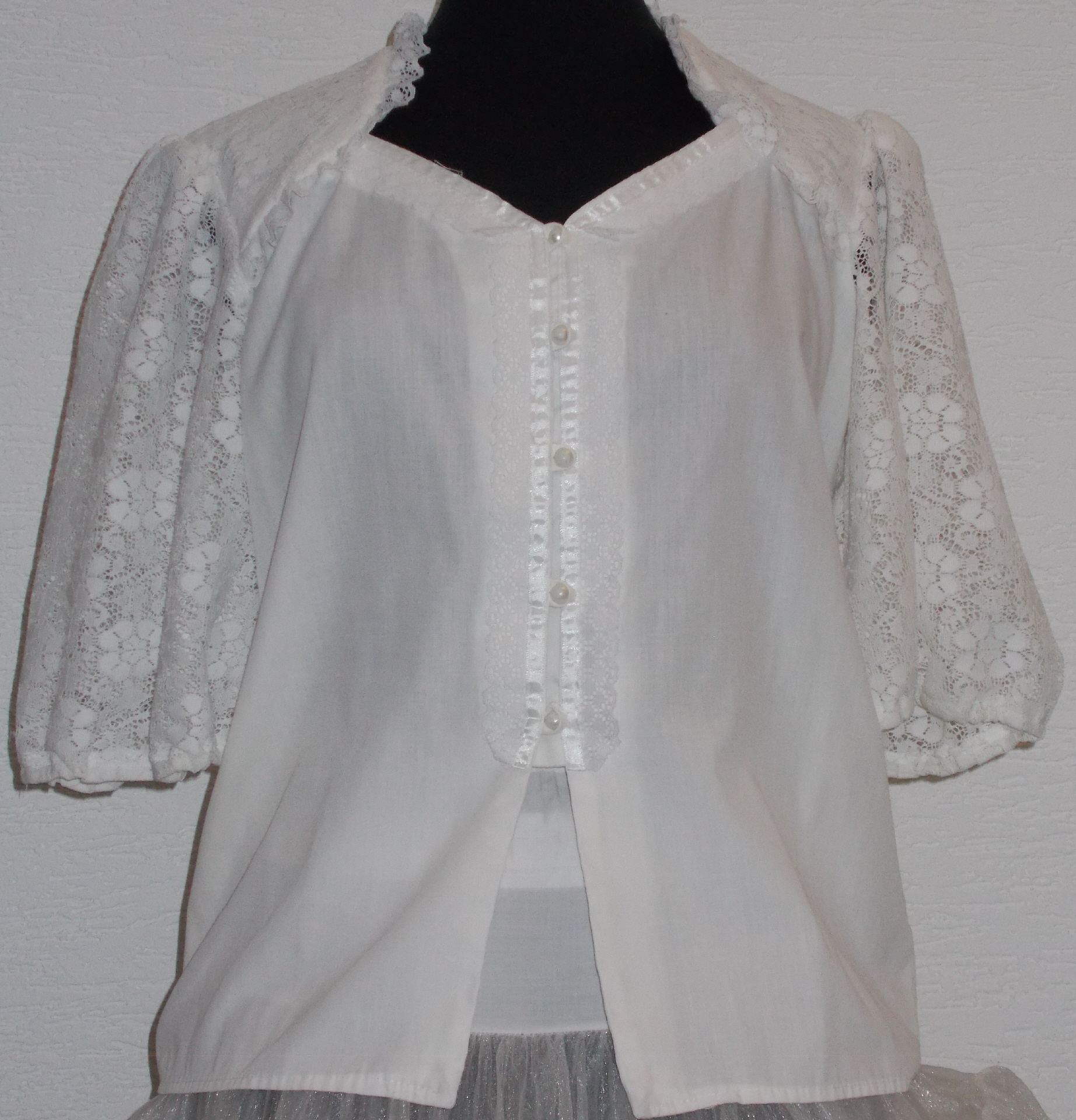 spitzzulaufender Ausschnitt, an den Seiten ein 10 cm breiter Spitzeneinsatz den Ausschnitt ziert ringsum eine 2 cm breite Spitze die Bluse ist vorne mit perlförmigen Knöpfen geknöpft links und rechts verziert mit weissem Satinband und weisser Spitze