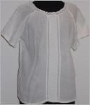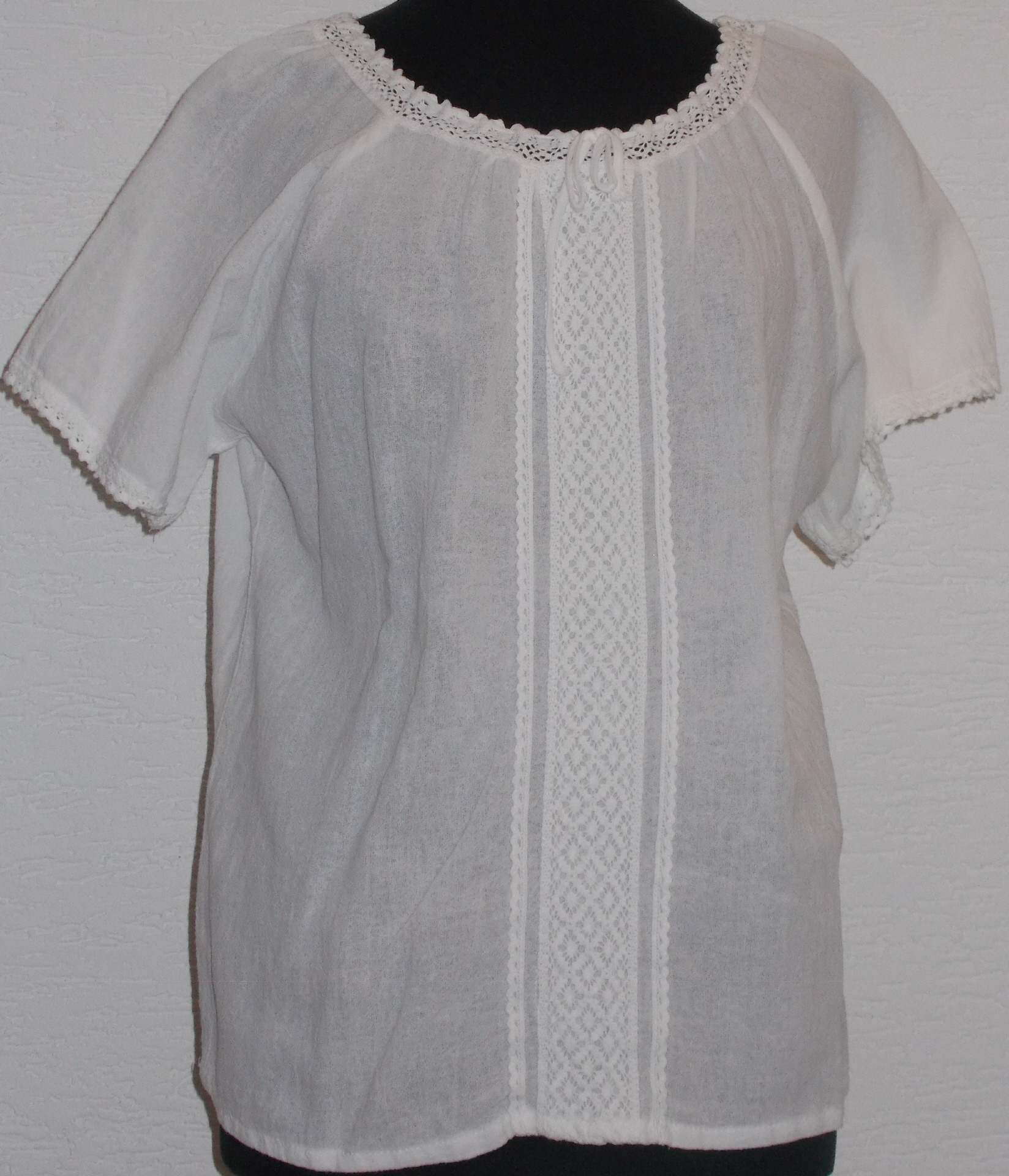 weisse Baumwollbluse vorne mit edler Spitze verziertrunder Halsausschnitt mit Bindekordelkurze Ärmel ebenfalls mit Spitze verziertMaterial:100% BaumwolleTOP Zustand!