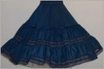 sehr weitschwingender dunkelblauer Tellerrock die oberste Stufe ist verziert mit 3 cm breiter blauer Spitze und Satinbändchen darunter eine 10 cm breite Stufe und zwischen der untersten Stufe eine 5 cm breites edles Spitzenband die unterste Stufe von 11 cm Breite trägt am Ende ebenfalls das 5 cm breite Spitzenband