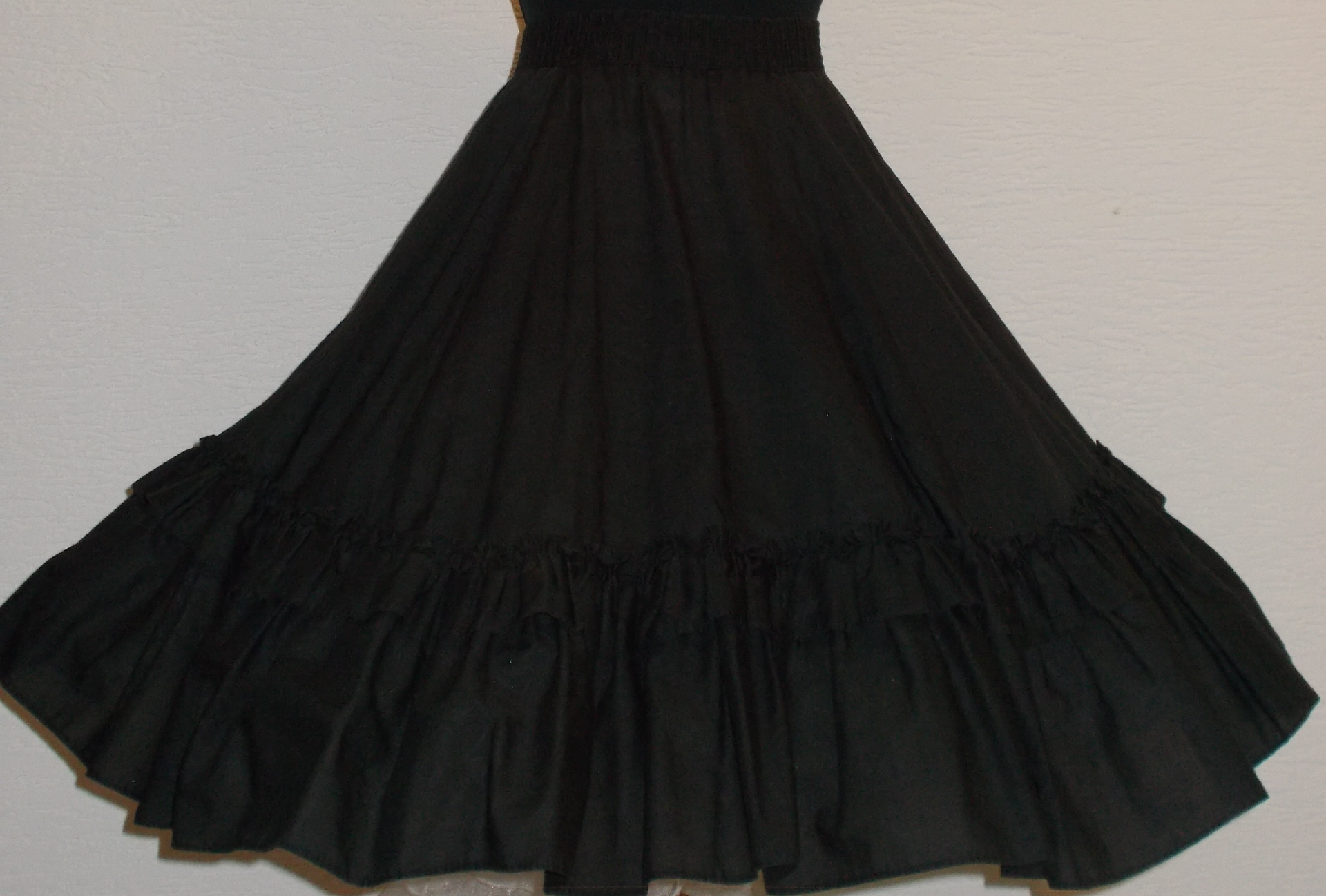 weitschwingender schwarzer Tellerrock der Marke Malco Modes Mod. 164 Gr. L unten mit 21 cm Volant, darüber ein kleines Volant mit 7 cm Gummibund 4cm breitguter gebrauchter Zustand!