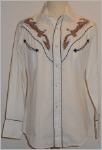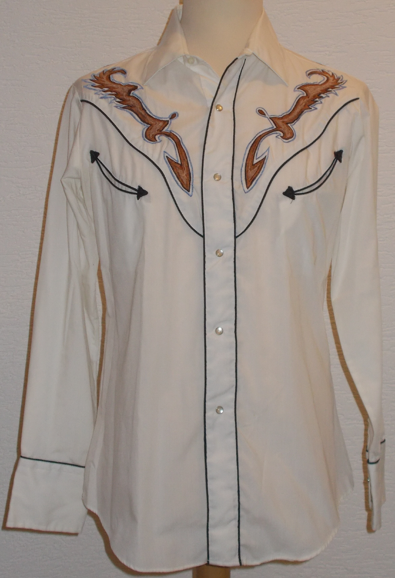 weisses Herrenhemd der Marke Levisdas Hemd hat hinten und vorne Applikationen in 3 verschiedenen Brauntönen und blau2 innenliegende Brusttaschen mit schrägen Eingriffenweisse Perlmutdruckknöpfeguter Zustand!