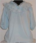 V-Ausschnitt mit 9-fach Biesen verziert, das ganze krönt eine edle 2 cm breite Spitze die Bluse ist im Vorderteil doppelt geknöpft mit 6 Knöpfen, perlförmig mit Goldkranz die Bluse hat leichte Schulterpolster und lange Ärmel in der Länge von 63 cm