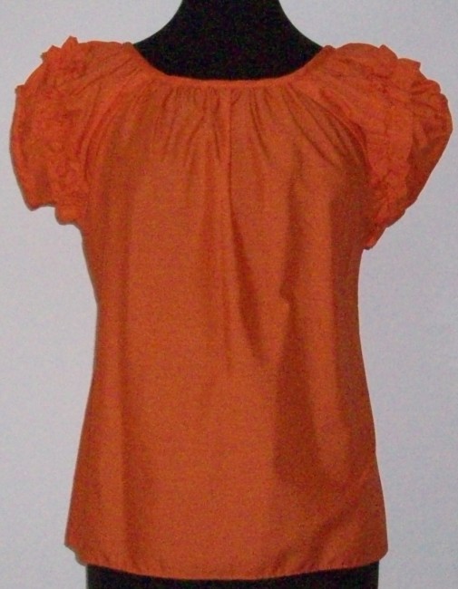 orangefarbene Bluse (Halloween)Grösse Smallrunder, eingefasster Halsausschnittleich angeschnittene Ärmelchen mit aufgenähtem Volant