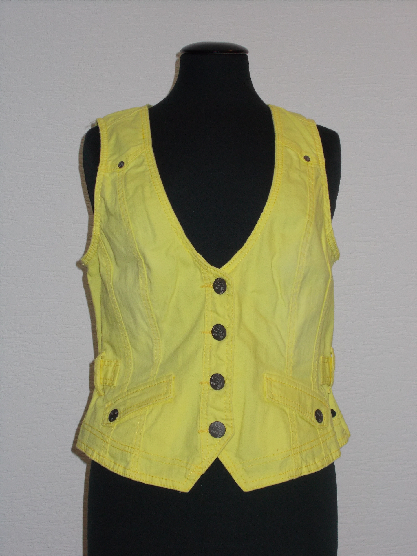 Damen Weste zitronengelb der Marke Cecil Gr. Munten 2 kleine Täschchenvorne geknöpft mit dunklen KnöpfenMaterial: 98% Baumwolle2% ElasthanBrustumfang: 94 cm Taille: 82 cmLänge: 52 cm TOP Zustand!